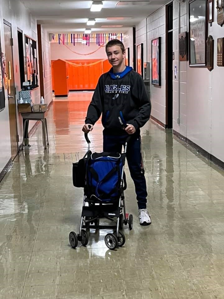 We can only hope this high school kid didn't steal this stroller from a baby on the way to school. He looks innocent enough but you can never really tell can you. This backpack alternative is clever. It's practically like a suitcase. If only he had a human development class where they give you a fake baby to take home. He would be extra set.
