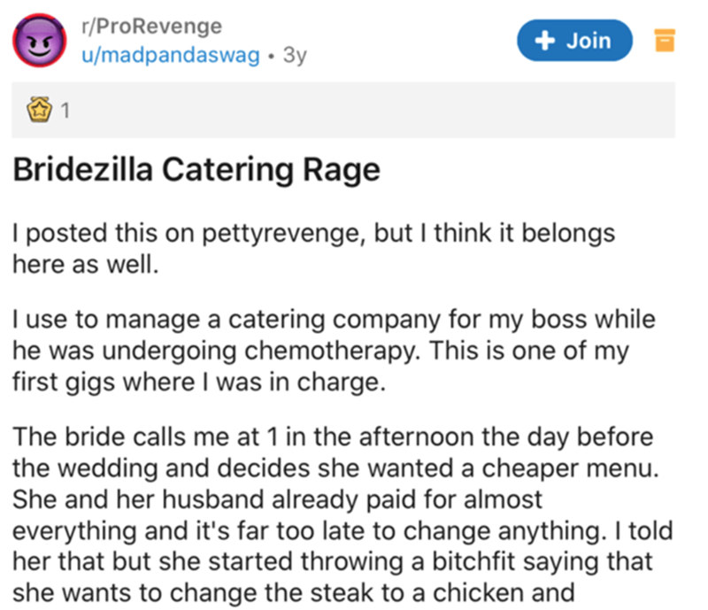 It's not to hard to tell that this is the very kind of contract that was designed by someone who has dealt with their fair share of bridezillas in the past. This bridezilla vastly underestimated the person that she was dealing with. Check out some more revenge drama with this revenge tale about a scummy collection agency who messed with a guy's credit score.