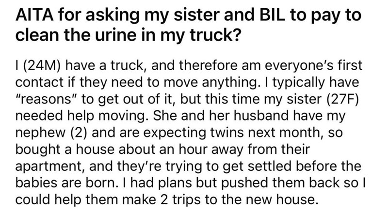 This ones has a pretty easy answer. Guy is an absolute arsehole with the way that he treats his sister. Then he has the GALL to ask her and her husband to pay the cleaning costs for the truck.