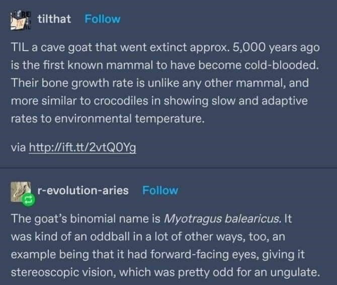 It's unusual to get these kinds of heebie jeebies when looking at a mammal, but this isn't any normal mammal. Tumblr takes a look at the weird, cold-blooded, cave-dwelling, forward eyed goat that looks like the kind of thing you would never tell about your parties. It's as if this is the reason that some goats scream.