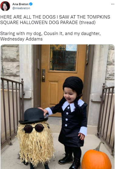 Oh hey there Cousin It and Wednesday Addams! Looking sharp! We are quite impressed with this doggo's take on Cousin It. The sunglasses over the upside down bucket mop of hair are just utter perfection.