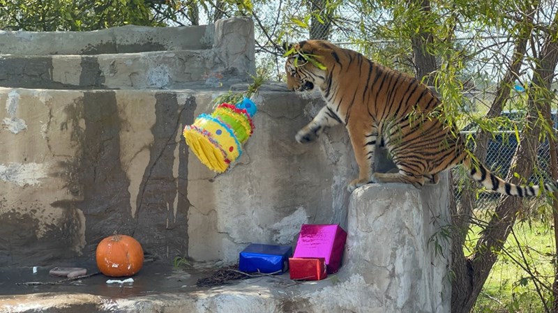 Elsa enjoying her piƱata on her special day! We love to see animals thriving and it would appear that Elsa has made an amazing transformation since she was relocated to her new home at the animal sanctuary.