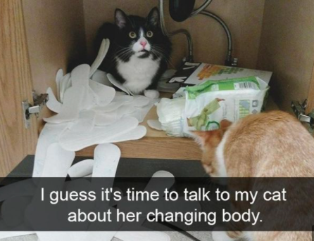 There comes a time in every woman's life where she must learn about her changing body and adjust accordingly. For this cat, that moment came right flippin now. Just kidding! Though we suggest that her human better protects the household's sanitary products, those things are expensive!