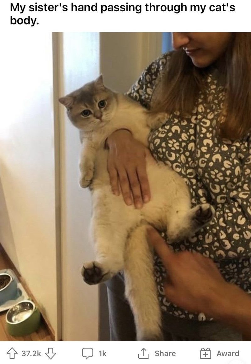This hurts us deeply to look at. The cat should be in distress, it has a whole ass hand puncturing its stomach.