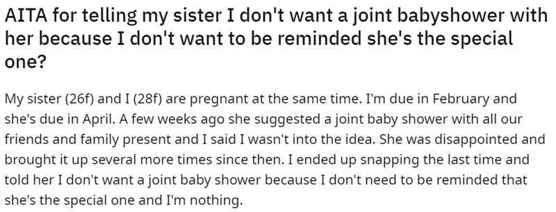 Pregnant Woman Declines Joint Baby Shower With Pregnant Sister, Fearful Of Sister Being Center Of Attention