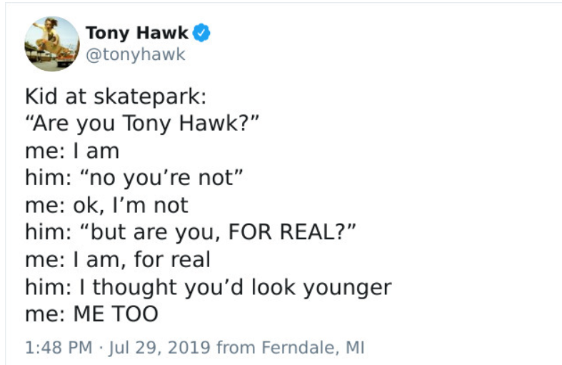 Imagine surfing next to Tony Hawk and telling him he looks like Tony Hawk. Unreal embarrassment.