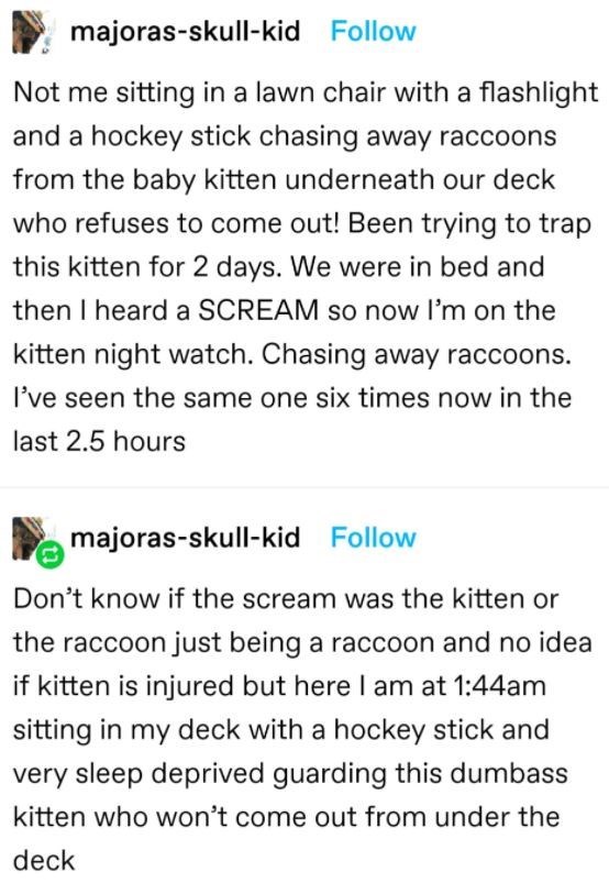 It's a story for the ages. You, out there in the darkness, wielding a hockey stick and fending raccoons away from a kitten that was as terrified of you as it was of them. No gratitude from it or nothing. You just did it because it was the right thing to do, and we are amazed.