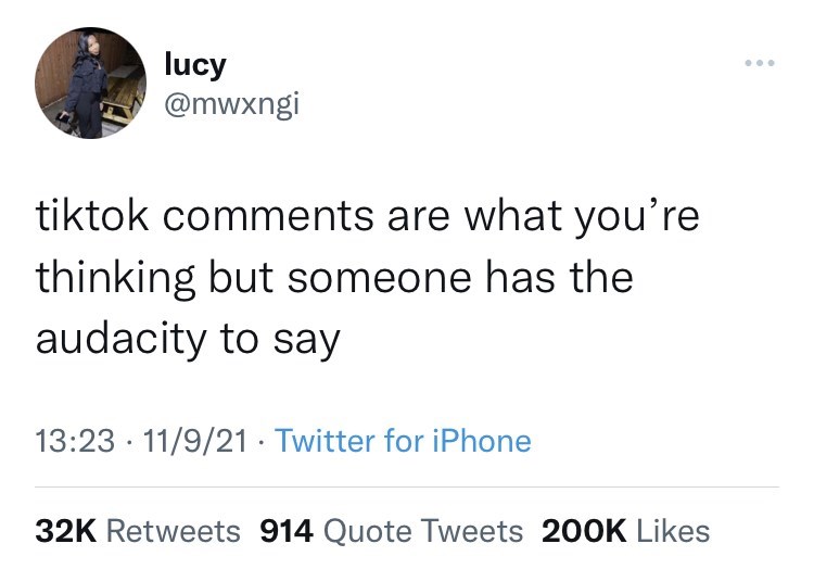 This Lucy character said it best: "tiktok comments are what you're thinking but someone has the audacity to say." Basically, on TikTok, people have absolutely no filter.
