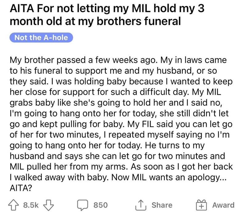 These in laws need an attitude check. You probably shouldn't be grabbing a baby away from its mother. Especially when said mother is in the process of grieving the profound loss of the loss of a sibling.