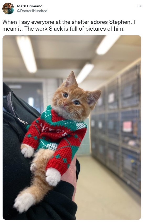 Cat - Mark Primiano @Doctor1Hundred When I say everyone at the shelter adores Stephen, I mean it. The work Slack is full of pictures of him.