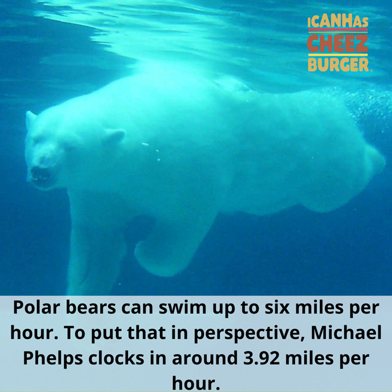 If Michael Phelps has 23 Olympic gold medals, how many could a polar bear win? If it wasn't dangerous for polar bears and humans to interact, I think the world would be extremely amused to watch that race. On top of that, I'd like to see Michael Phelps swim in sub-arctic water. See if his 23 medals can hold up then.