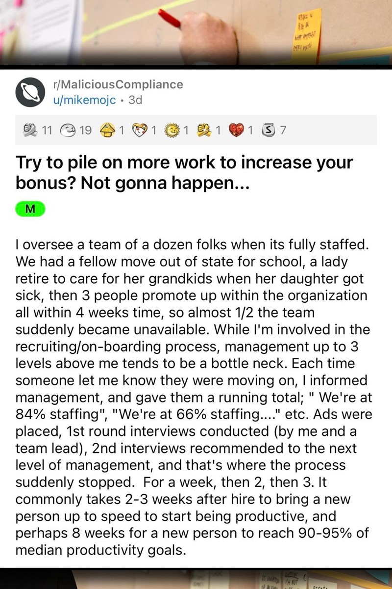 This post to Reddit's r/MaliciousCompliance community by u/mikemojc showcases how one team leader didn't let this kind of scheme by throwing the problem back on upper management for not hiring people to replace staff that left — the malicious compliance this team leader dished out left their team members with bonuses while middle management got nothing for screwing up.