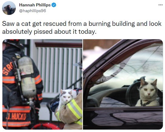 Car - Hannah Phillips @haphillips96 ... Saw a cat get rescued from a burning building and look absolutely pissed about it today. J. HUCKO STAC