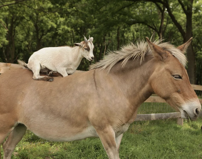 Awww, we can just picture what this tiny smol goat is saying to his horse friend, "Giddiup, I'm late to my fancy goat function!" Yep, that's totally what he's saying right now, good thing we're certified goat whisperers so we could interpret this photograph, which is honestly a masterpiece.