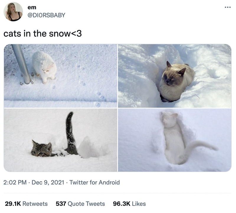 Just four precious felines playing around in the snow and having a grand old time. This is what holiday season is all about, folks. Going outside and appreciating the miracles that winter provides us with, like this beautiful snow.