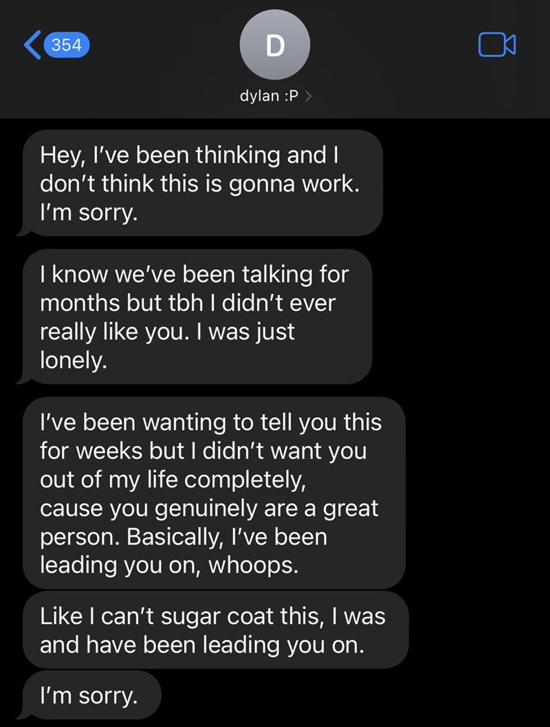 out of my life completely, cause you genuinely are a great person. Basically, l've been leading you on, whoops. Like I can't sugar coat this, I was and have been leading you on. I'm sorry." -