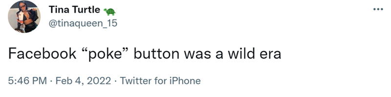 Font - Tina Turtle @tinaqueen_15 Facebook "poke" button was a wild era 5:46 PM · Feb 4, 2022 · Twitter for iPhone