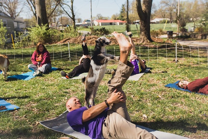 According to Backyard Goats, photographer Lainey Morse started goat yoga by accident. When she was going through tough times, she took solace in her goats and sometimes invited friends who needed a pick-me-up for "Goat Happy Hour" too. One day, an acquaintance asked Lainey if she could host a yoga class at her farm. Lainey said sure, but the goats would be climbing on them and hanging around. And thus…goat yoga was born!