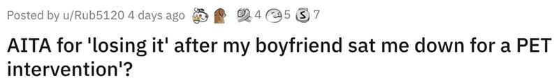 "Yesterday, I came home and he tells me we have to talk. I sit down, and kid you not, he begins holding an intervention on my treatment of my pets. Honestly, I lose him. I began shouting and asked him to get out. He told me he was only looking out for me and my dogs, but reluctantly left after refusing for 15 minutes."