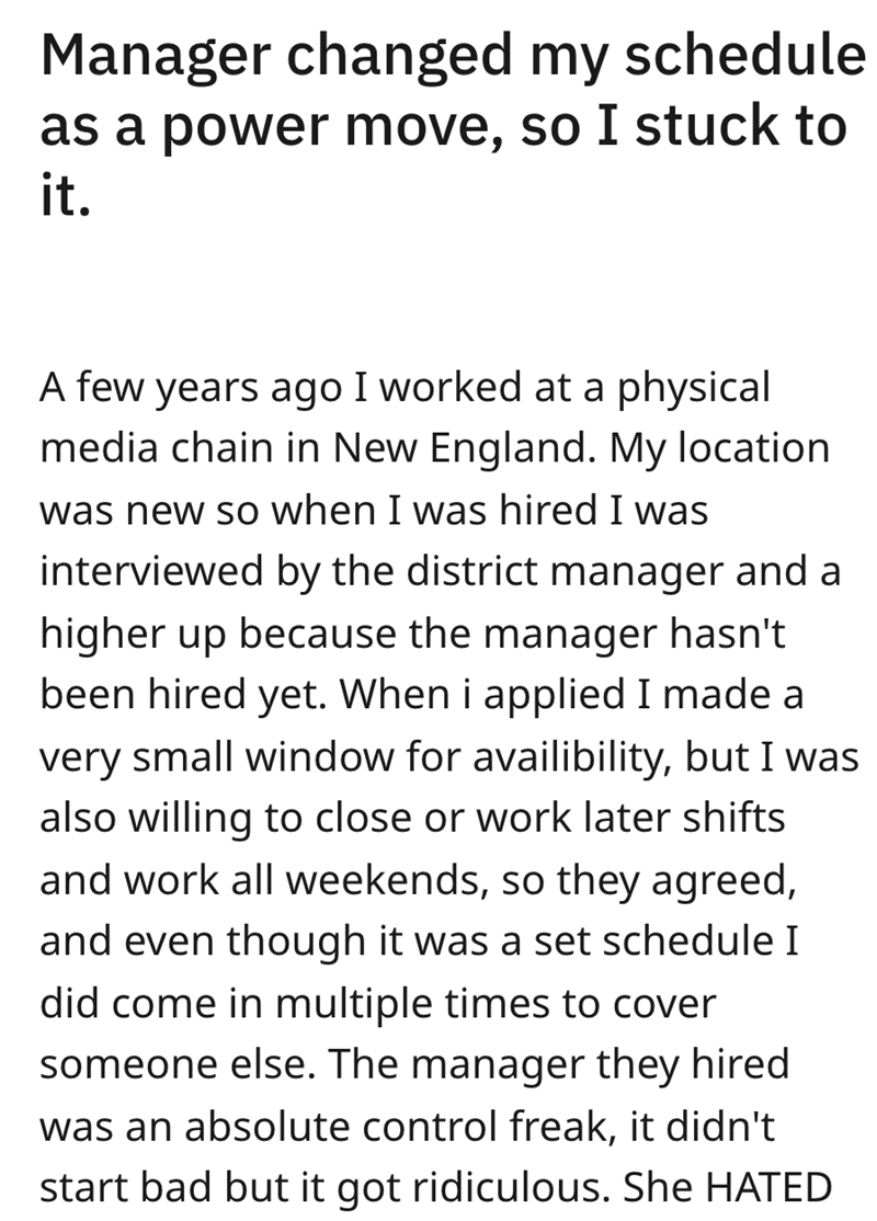 Manager changed my schedule as a power move, so I stuck to it.