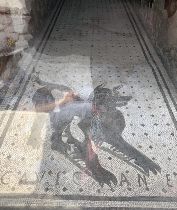 "Another guard dog in the "faucês" or entrance hall/front door of a well off Roman family home or domus."