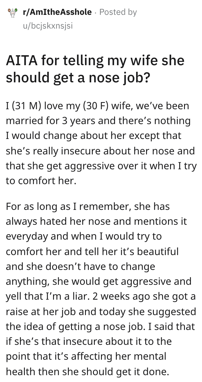 Internet Supports Husband Telling His Wife She Should Get a Nose Job