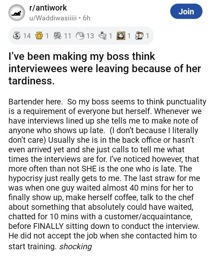 Font - r/antiwork Join u/Waddiwasiiiii • 6h S 14 1 2 11 e 13 1 1 1 I've been making my boss think interviewees were leaving because of her tardiness. Bartender here. So my boss seems to think punctuality is a requirement of everyone but herself. Whenever we have interviews lined up she tells me to make note of anyone who shows up late. (I don't because I literally don't care) Usually she is in the back office or hasn't even arrived yet and she just calls to tell me what times the interviews are