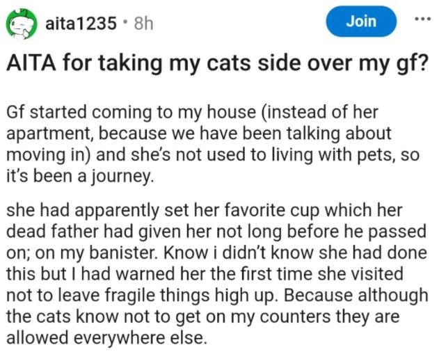 It's not the easiest situation because it's kind of no one's fault, not really. The cat was just being the cat. The girlfriend didn't do anything other than bringing her mug. And the boyfriend yelling… while it's not the best thing to do, and he clearly sees that he might have gone overboard, who else would defend the cat if not him?