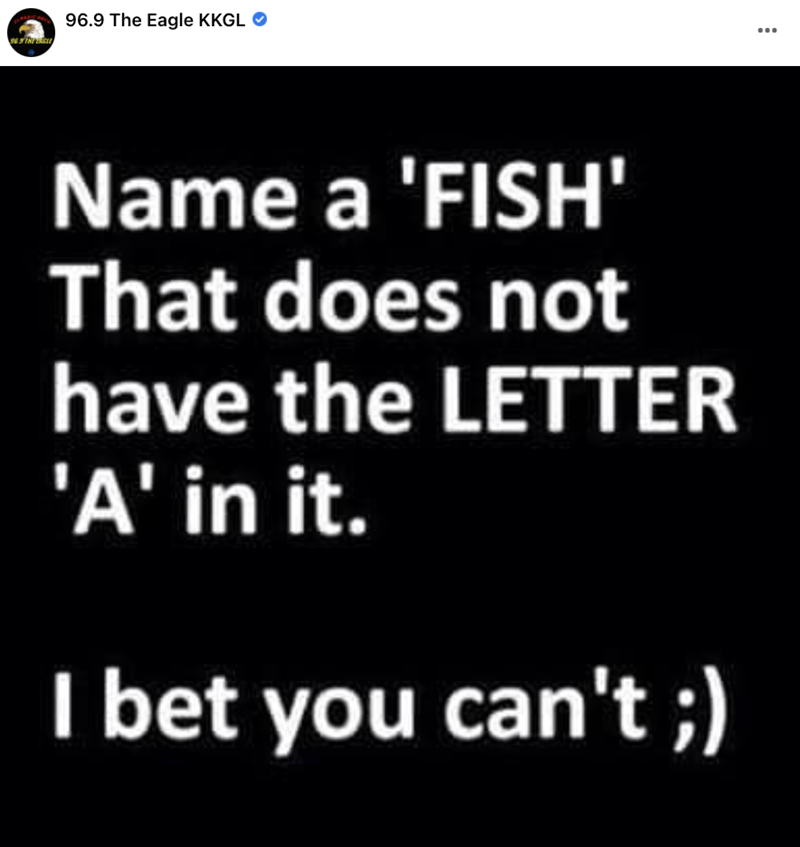 See, this seems easy, right? Like we don't want to brag, but we feel like we could do this if we sat down and thought about it for a few minutes. Right off the bat we're thinking that maybe a good fish name without a in it would be… hmm. actually this isn't that easy, maybe blue fin… wait a second no!