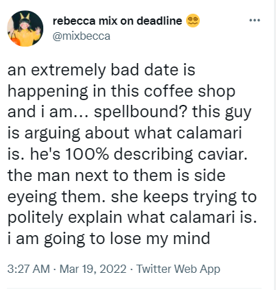 Woman Eavesdrops On Bad Coffee Shop Date In Which Man Is Convinced That Calamari Is Caviar