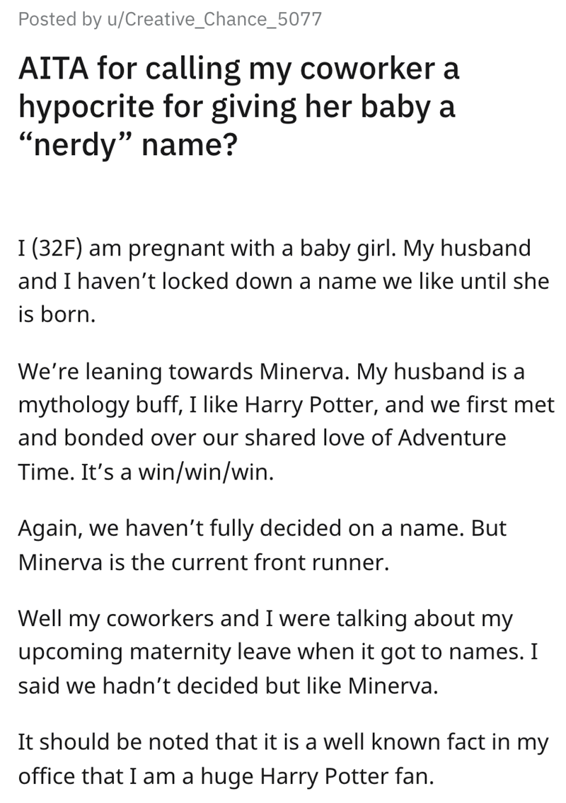 Another round of "Millennial Fandom Baby Names" has kicked off this week. In one corner, we have this coworker who idolizes the Joker and Harley Quinn, and in the other, we have this Harry Potter "Potterhead." The hypocritical coworker is criticizing the Harry Potter fan for wanting to name their child after a Harry Potter character. The thing is, the coworker has already named their kid after a character from their fandom too.