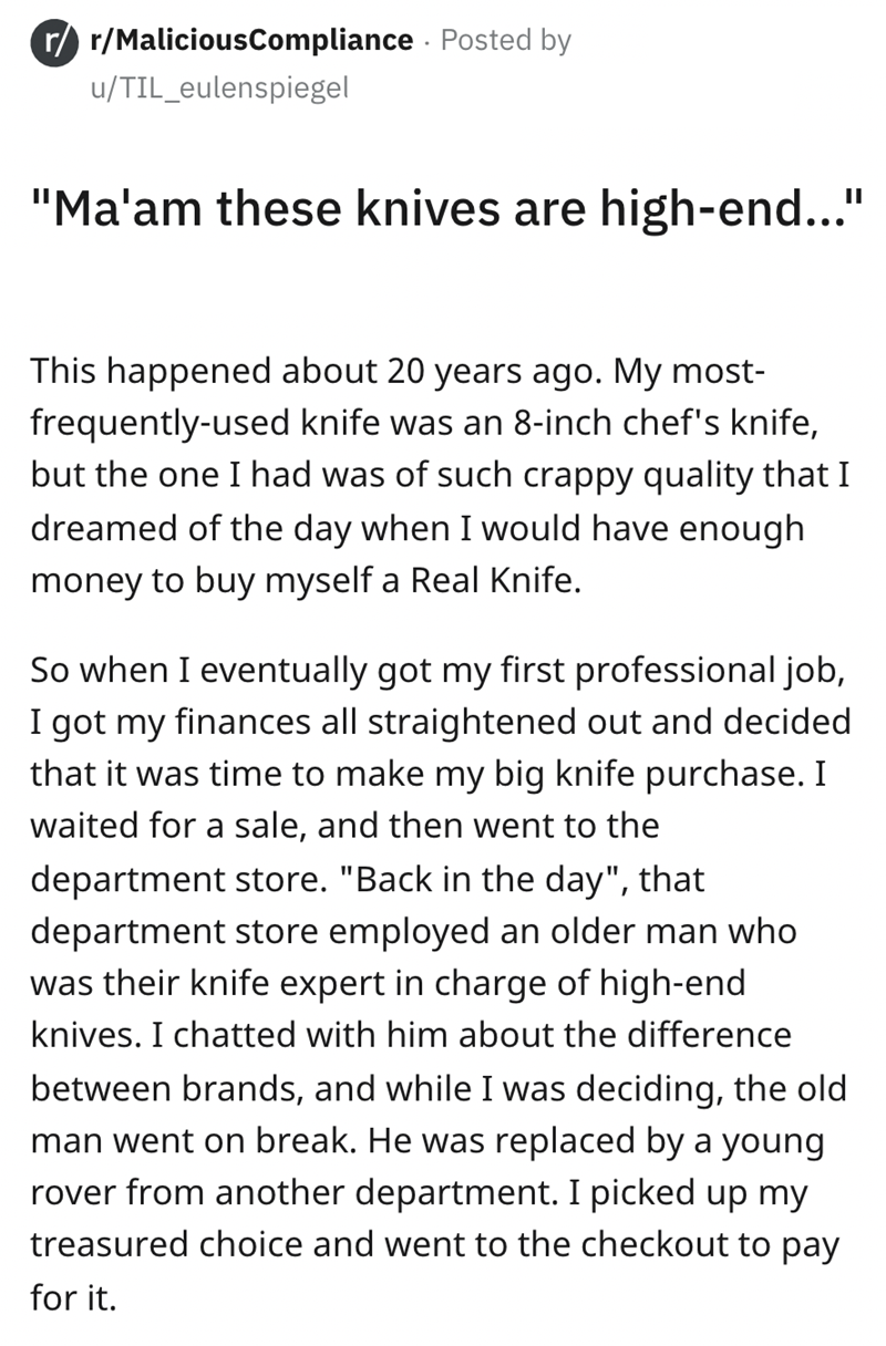In this case, that marginalization worked in u/TIL_eulenspiegel's favor. She gave up on correcting the young man and ended up with a hell of a deal on a knife. Sounds like a win to us.