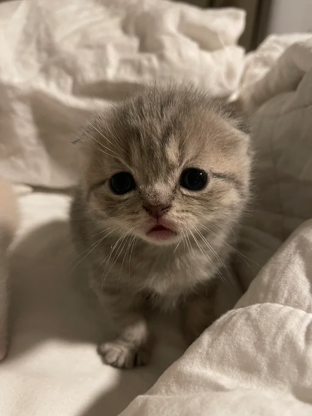 Oh, look. A criminal. No ears on this criminal. How dare it commit such a heinous crime? The folded ears only make it cuter. The little paw that's placed purrfectly for the light to fall on it as if in a form of blessing… weak. We are weak, and this kittens already holds our heats in its paws.