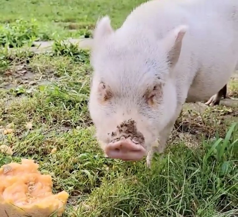 Every time a visitor arrives, Petunia drops whatever she's doing—snacking on pumpkins, stretching out in the swimming pool, or foraging on fresh grass and roots—and greets everyone with sweet little squeaks and a wagging tail.
