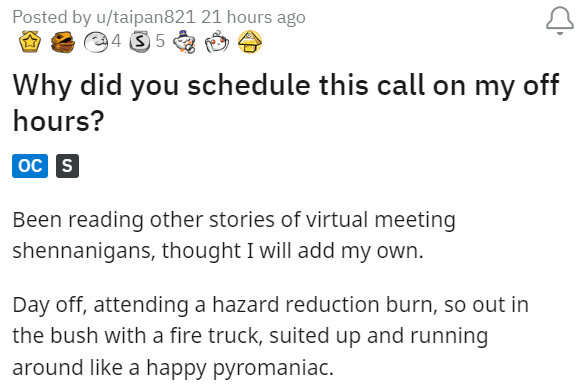 Meaningless mandatory work meetings are a drag. Meaningless mandatory work meetings that are scheduled during your time off are just stupid and disrespectful. And meaningless mandatory work meetings scheduled during your time off while you are actively participating in a hazard reduction burn, then being told you will be fired if you do not attend, result in stories like this.