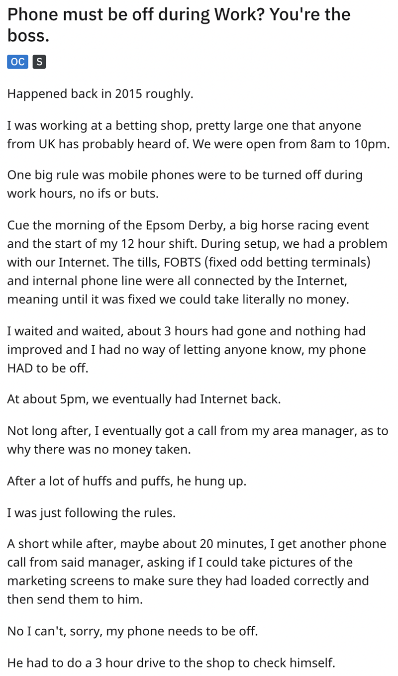 When an emergency did occur at u/Super-Monkfish's place of work they were quick to listen to their boss's commands and sat and made sure that they kept their phone off and did not use it. Predictably, that meant that the problem was not resolved because no one was made aware of it and the result was a large cost to business for the day of trading.