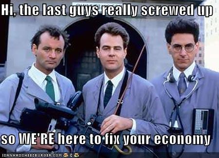 Hi, the last guys really screwed up so WE'RE here to fix your economy