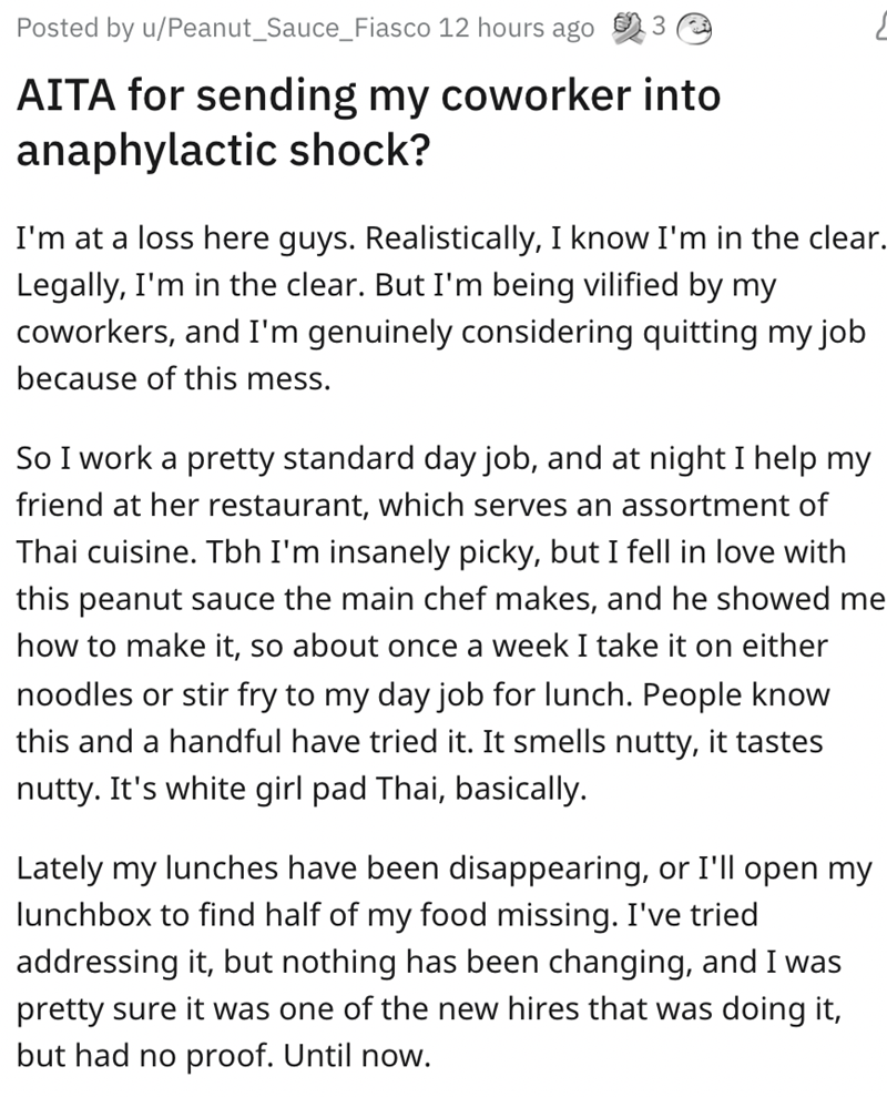This employee, who has a penchant for peanut satay sauce, discovered that their lunches were disappearing at their workplace. They made attempts to address it in the workplace but saw little result. One day, they had their proof of who was doing it. One of the new hires (who also happens to be the boss's daughter) was admitted to the hospital for anaphylaxis after "borrowing" their coworker's lunch. Effectively catching themselves red-handed. (Faced?) The problem is, because of the bizarro world this employee lives in, their coworkers are blaming them for the incident, "vilifying" them to the point where they are thinking about quitting their job.