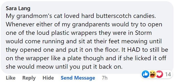 The fact that this cat is so specific in how she wants to eat these candies makes this story so much better honestly. Like- it was good already, imagining this cat rushing at your grandparents to get candies from them like a child, but the fact that she would meow until the candy was presented in the exact way that she wanted… yeah, we love cats.
