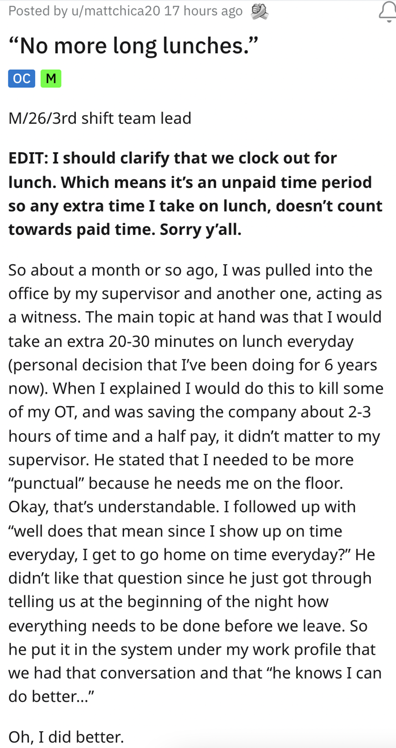 When this boss demanded that their subordinate shorten their unpaid lunch breaks, they didn't even pause to consider the consequences. Their subordinates had been taking these longer breaks as a favor to the company in order to cut down on unnecessary overtime. This rule change left the workers with but one option… Charge the time instead, which they were happily obliged to do.