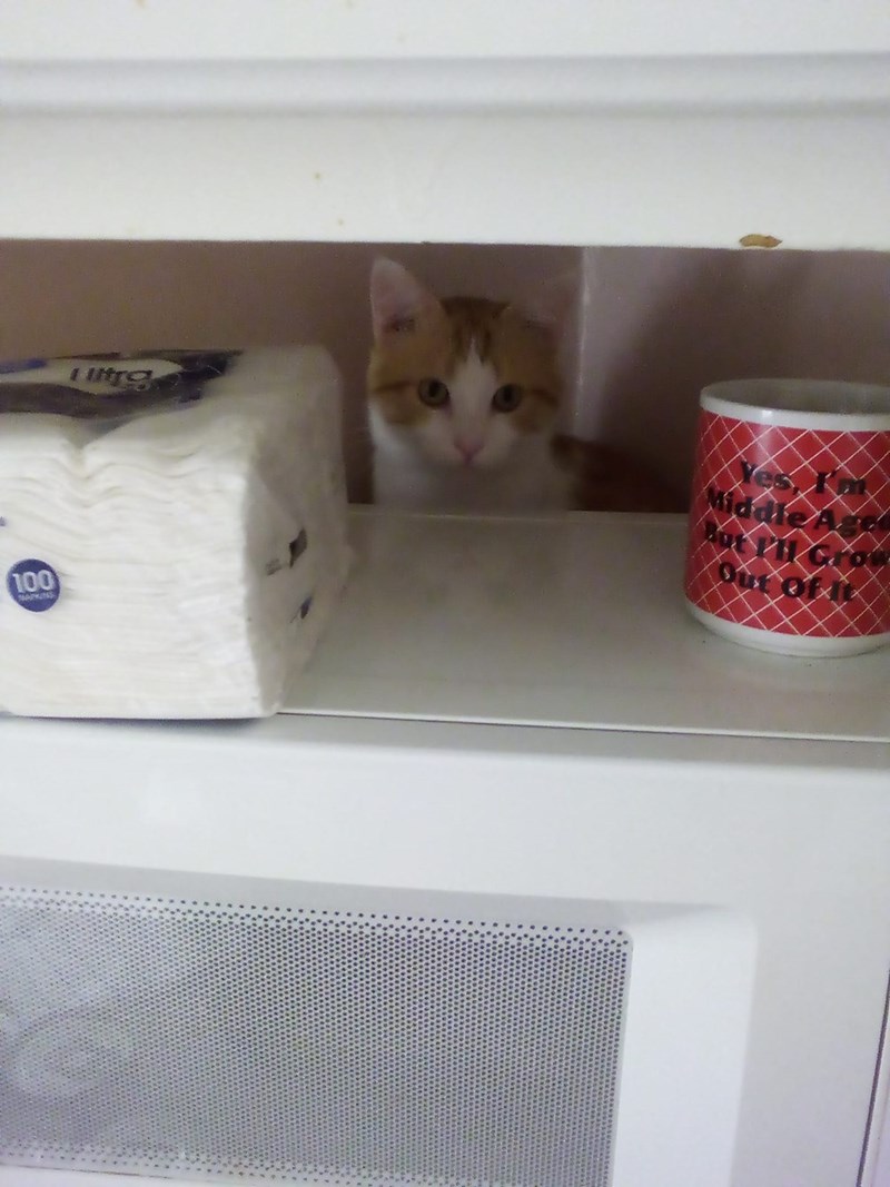 “My cat Goose likes to hide behind the microwave and spy on me while I'm making supper.”