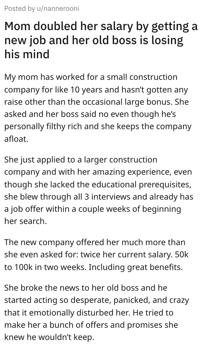 u/nannerooni explains that her boss was "filthy rich" but was as tight as he could be when rewarding the people who helped him get there. When the OP's mother told him of her offer, he offered to pay her more and admitted, "I haven't been paying you the value you are worth to me."