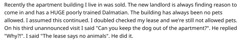 This is the type of move that we absolutely despise. This despicable landlord has decided that the only way to get what he wants, which is to be allowed to break the law, he needs to run OP out of the building. He's attempting to turn the other neighbors against OP, but we don't really think it's going to work. Which of the other neighbors is going to want this guy and his completely untrained dog in their apartment?