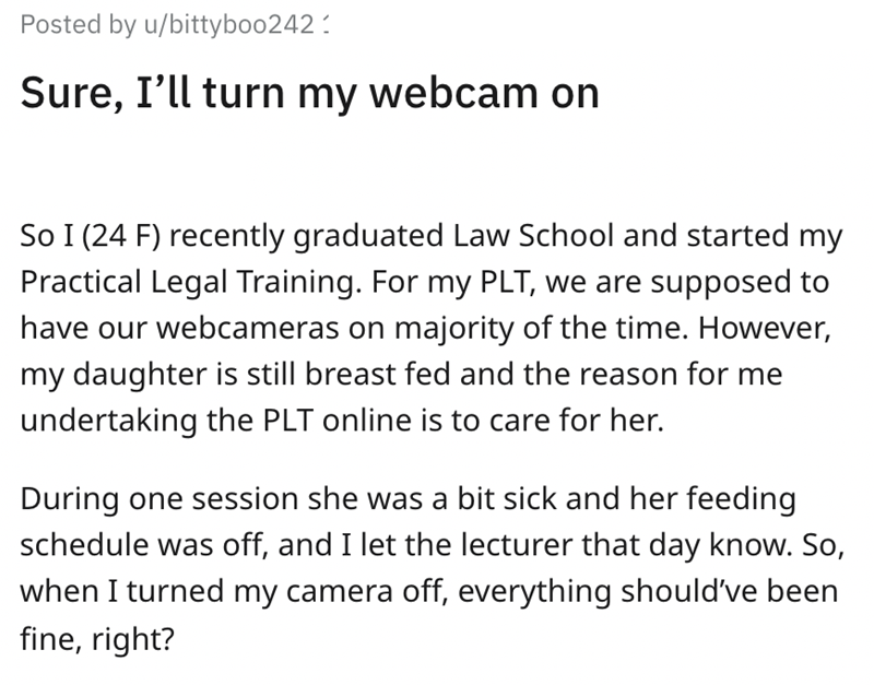 This thread was posted to Reddit's r/maliciouscompliance subreddit by Redditor u/bittyboo242, a new mother who recently graduated from Law School. She shared her story to the popular subreddit with the title, "Sure, I'll turn my webcam on." as a nod to her actions of malicious compliance.