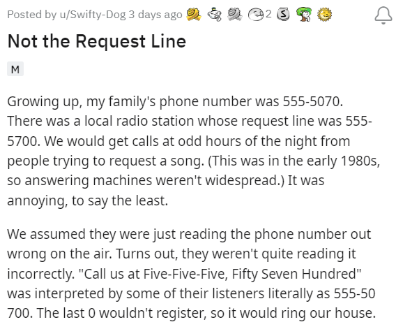 It seems like if you just asked nicely, people would be willing to help out. But that's nt always the case. Sometimes people will only solve a problem when it starts impacting them personally. And as it turns out, people mistaking your home phone number for a business puts you in a very effective place to make it that business's problem. This person recounted the time their phone number was mixed up with a radio station's request line, and it inspired others to share their weird experiences with similar phone number confusions.