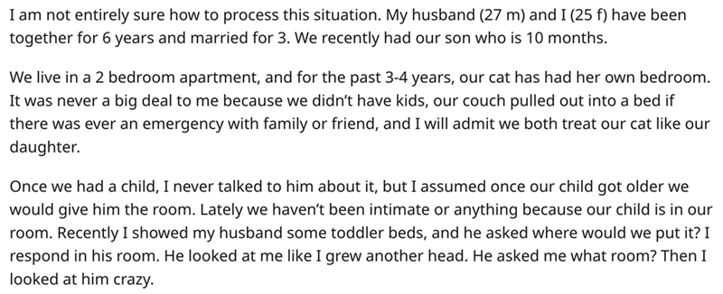 We're not entirely sure how to process this situation either, but we're going to try. This woman and her husband are still sleeping with their ten month old child in the room, even though they have a perfectly good room right next to theirs that the cat barely uses! It sounds like they need to get some of their priorities in order.