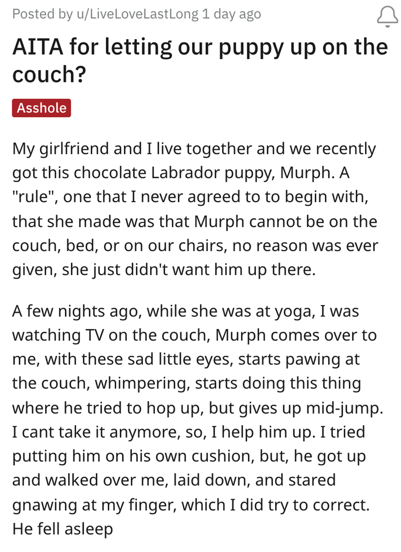 Reddit has convicted this guy as an 'A-Hole' for breaking his promise to his girlfriend, but I want to take a look at an alternative take here. From the puppy's point of view he would have been the 'A-Hole' if he hadn't let the little guy up. After all, why should he have all of that comfort to himself while poor Murph is stuck down there on the cold hard ground?