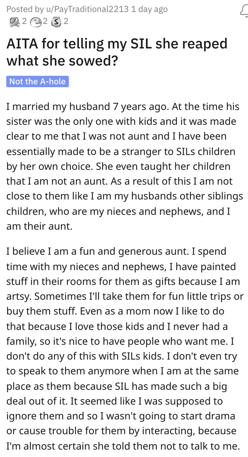 This thread was posted to Reddit's r/AITA (Am I the A-Hole) subreddit by the aunt, Reddit user u/PayTraditional2213. She posted the topic with the title "AITA for telling my SIL she reaped what she sowed?" to appeal to readers and see whether or not she was in the wrong for her reaction to her sister-in-law.