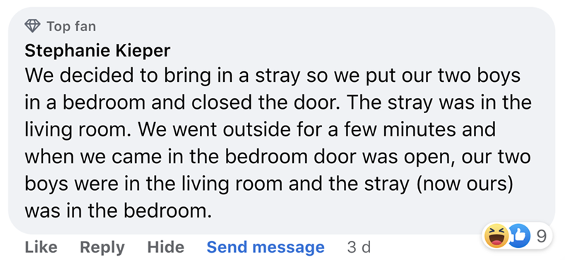 The stray really said, 'erm… so you're going to give me the couch to sleep on? That's kind of like really rude. How about you take these two lover boys and have them sleep on the couch? I think that sounds like a plan. Alright, boys, off you go! Toodles!'