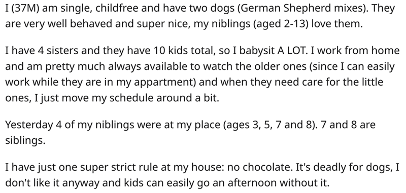 Ok first and foremost, we will absolutely be stealing niblings to mean nieces and nephews that you treat like your little siblings. Second of all, this rule makes a lot of sense. With kids still learning what is and isn't safe, it can be a real danger to animals if they just go about feeding everything they're eating to the dogs willy nilly.